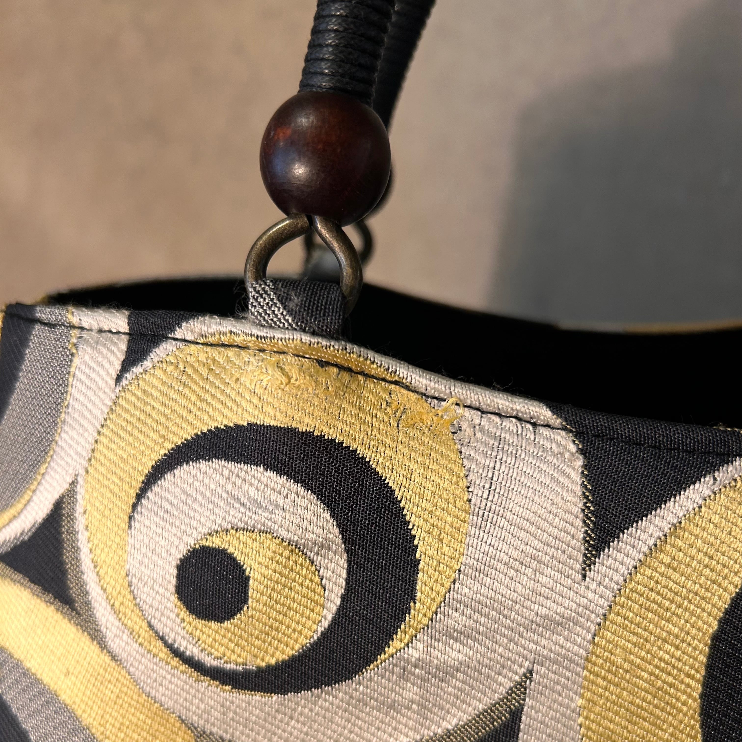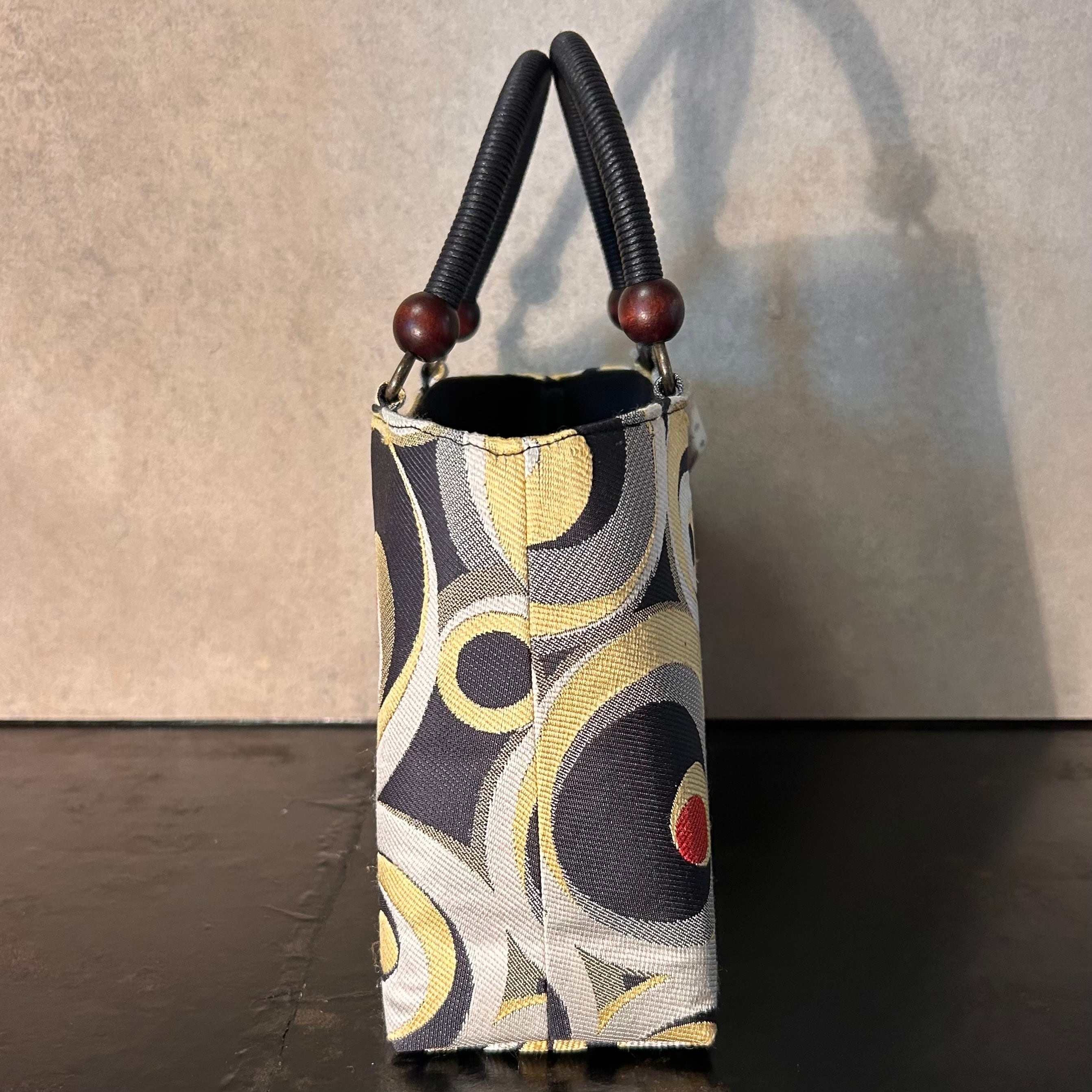 西陣織の帯を贅沢に使用し、個性的なな丸柄に赤い丸をアクセントとして織り込み、エッジのきいたデザインが魅力的。