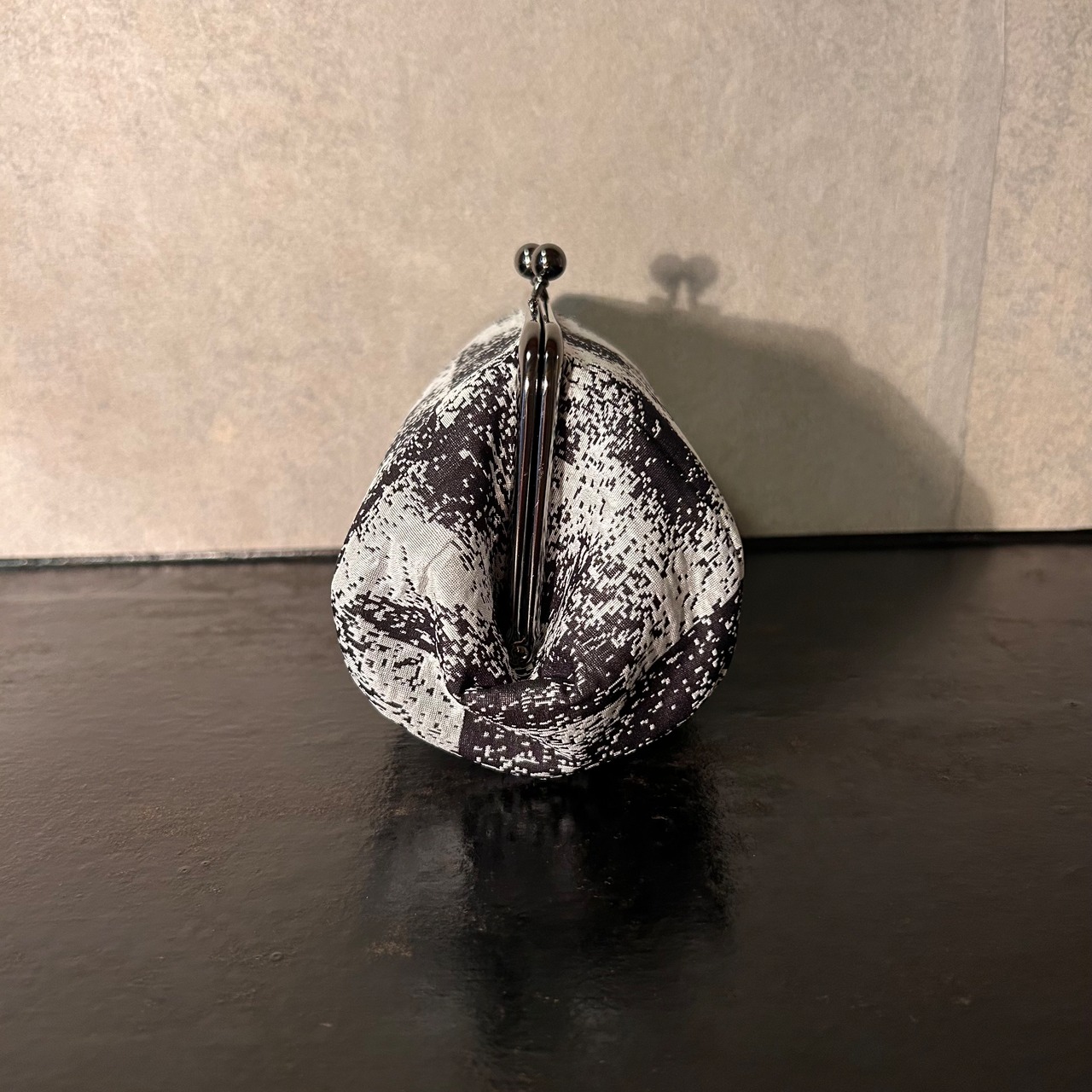 モノクロのモザイク調柄と、がま口のクラシカルな形が上品に調和。