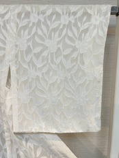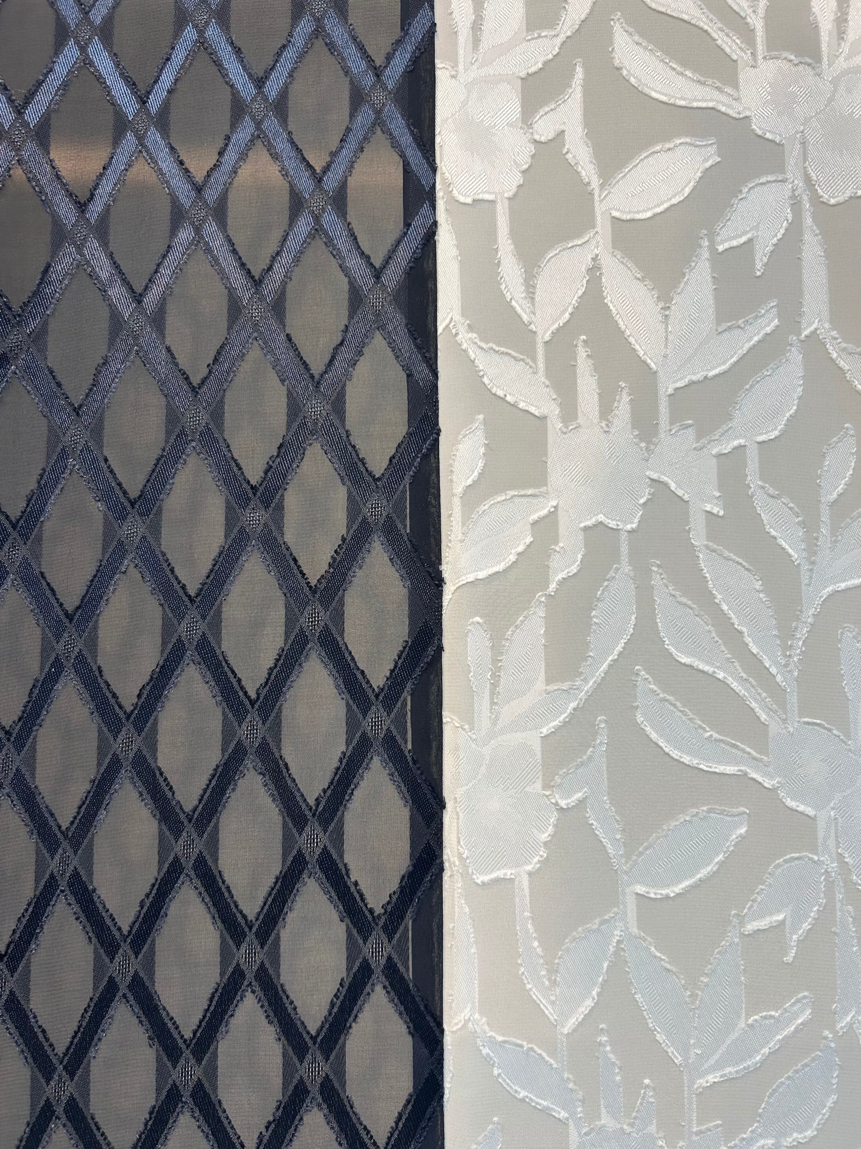 ★ 左右で異なる透け感生地を使用した、初めて作ったツートーンのユニークな羽織。ネイビーのダイヤ柄とホワイトの花柄が印象的。